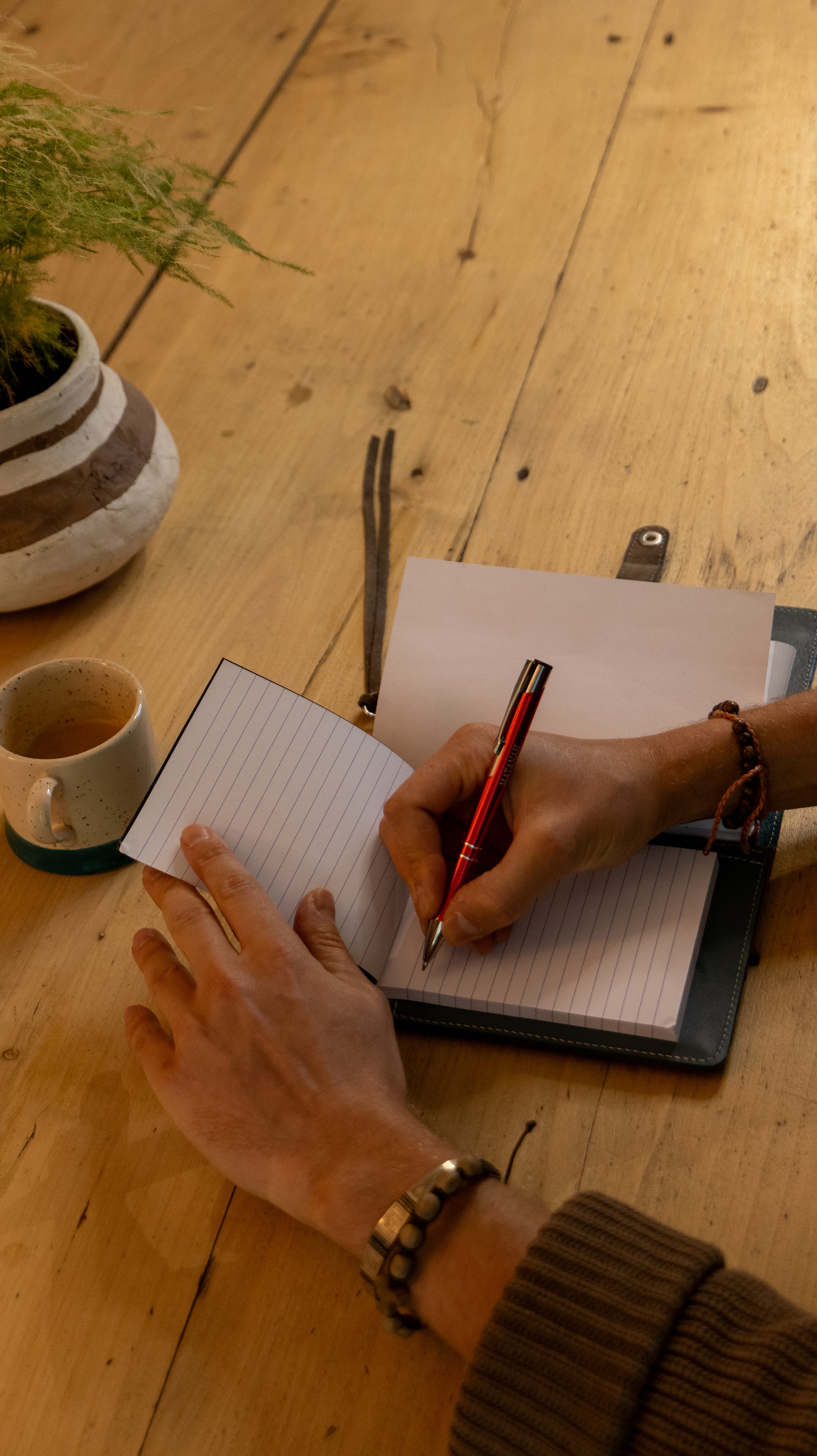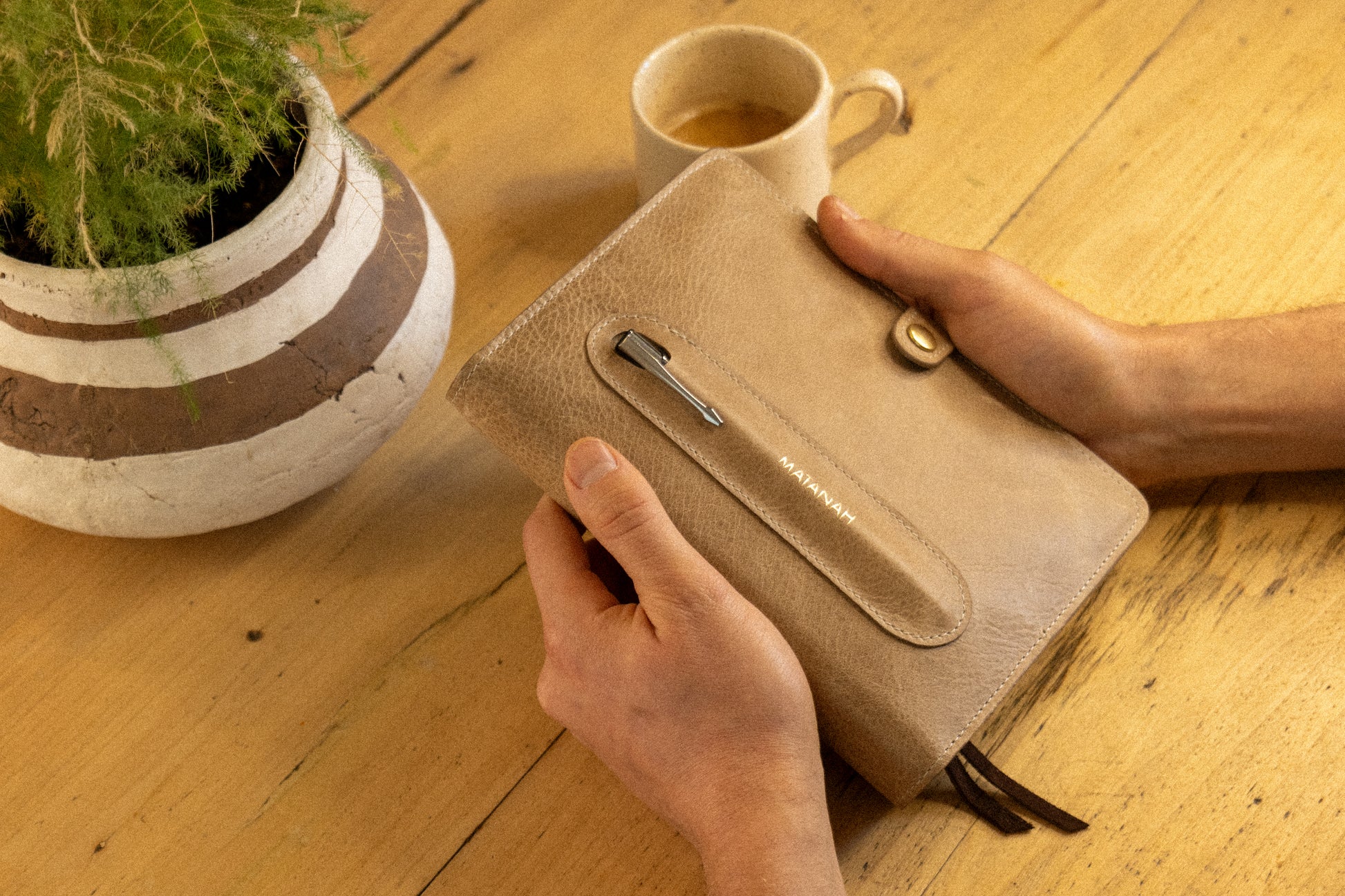 - Porte-stylo intégré avec stylo Matanah : une pièce de cuir façonnée pour accueillir votre stylo préféré.